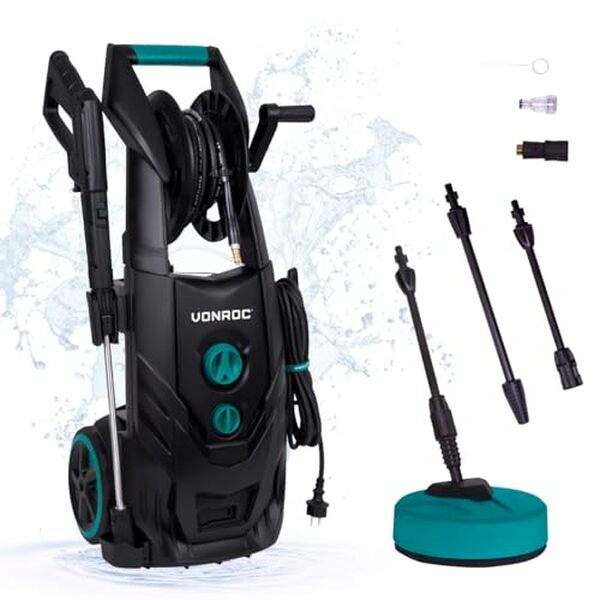 VONROC V25-2 Nettoyeur Haute Pression 2500W – 195 Bar - Réservoir de Détergent Réglable - Débit 468L/h, 50° Max. - Tuyau, Pistolet, Buses, Lance de Rallonge, Aiguille de NettoyageNettoyage Efficace des Surfaces Extérieures – Ce nettoyeur haute pression VONROC délivre une pression maximale de 195 bar pour éliminer facilement la saleté incrustée. Son débit de 468 litres par heure permet un nettoyage rapide des terrasses, façades et allées Adapté à de Nombreuses Utilisations – Il convient pour le nettoyage des murs, patios, terrasses et mobilier extérieur. Il peut également être utilisé pour laver voitures, scooters et camping-cars en ajoutant du détergent dans le réservoir intégré Grande Liberté de Mouvement – Le câble d’alimentation du nettoyeur de 5 mètres et son tuyau haute pression de 8 mètres offrent une bonne amplitude de déplacement. Le système marche/arrêt automatique optimise la consommation d’eau et d’énergie Livré Avec Tous les Accessoires Essentiels – Le kit comprend un pistolet, une buse réglable, une buse turbo, une lance de rallonge, un tuyau haute pression et une aiguille de nettoyage. Le dosage du détergent est réglable directement depuis le réservoir Le Choix du Meilleur Outil - VONROC développe toute une gamme d'outils et d’accessoires de bricolage de haute qualité. Ses spécialistes et ingénieurs conçoivent les produits aux Pays-Bas en respectant des normes de qualité élevées. Faites le bon choix et réalisez vos travaux en toute sécurité !230,95 €